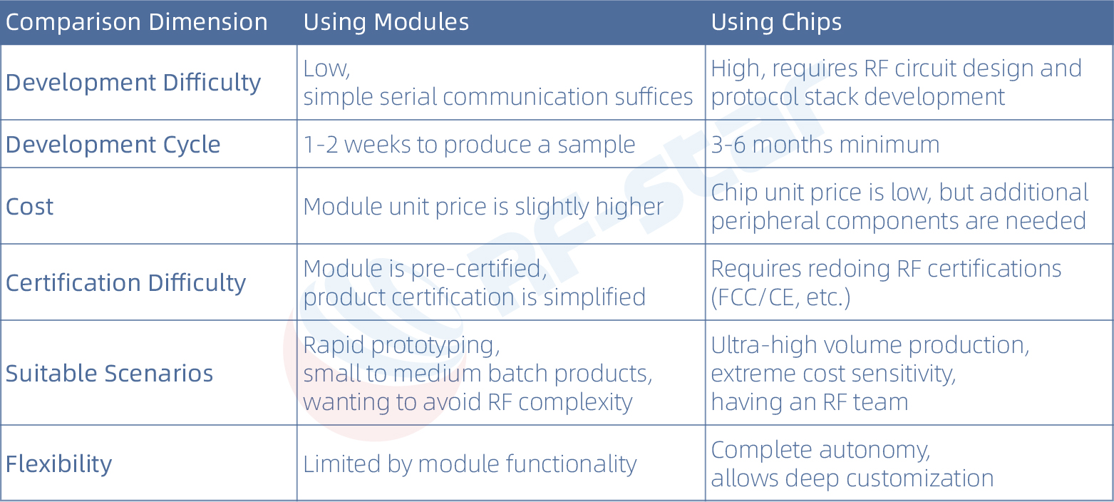 Gợi ý: Đối với 90% sản phẩm IoT, sử dụng mô-đun tiết kiệm chi phí hơn. Thời gian phát triển và chi phí chứng nhận tiết kiệm được vượt xa sự chênh lệch giá của mô-đun.