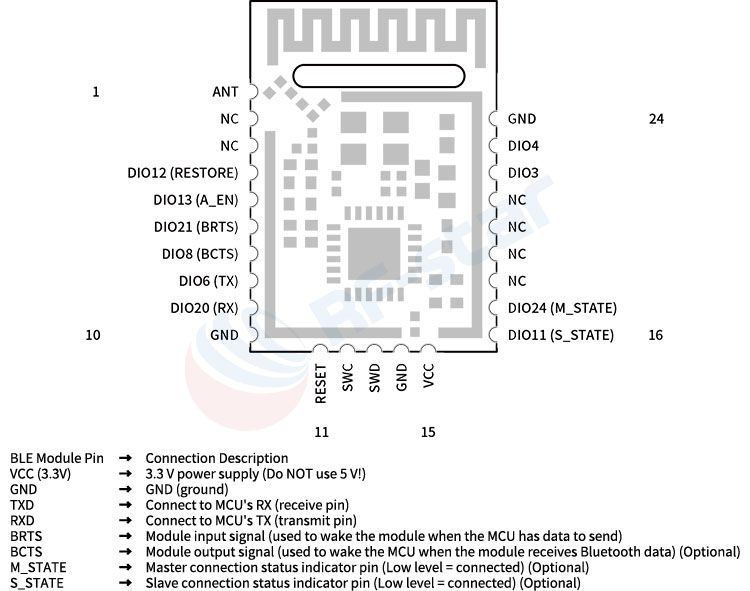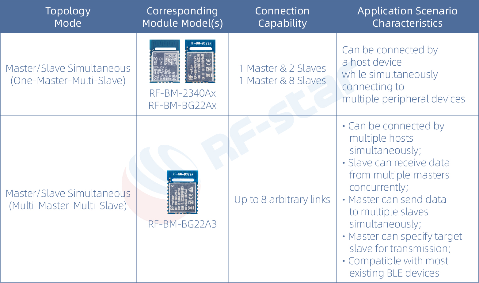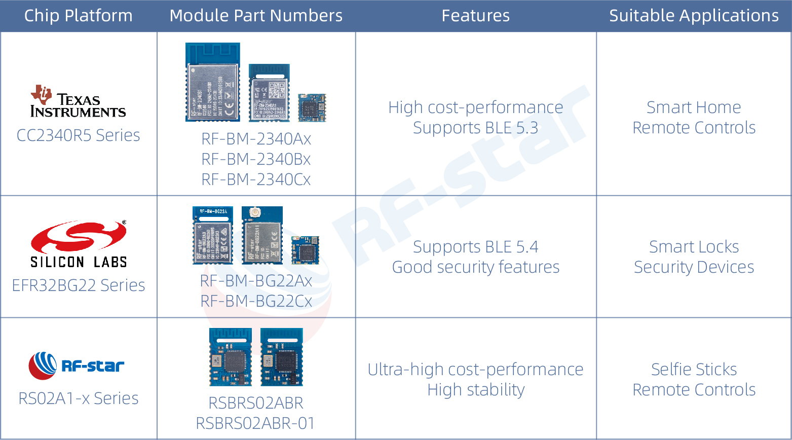 Mô-đun điều khiển: Nó có khả năng xử lý riêng và có thể được lập trình cho logic. Khách hàng có thể tự viết chương trình để sử dụng lõi bên trong của chip, có khả năng tiết kiệm được một MCU bên ngoài và giảm chi phí. Ví dụ, RF-star RF-BM-2340B1 sử dụng TI CC2340R5, có lõi ARM Cortex-M0+ tích hợp sẵn, và tất cả các chân GPIO đều được đưa ra ngoài, cho phép nó xử lý cả giao tiếp Bluetooth và các ứng dụng người dùng.